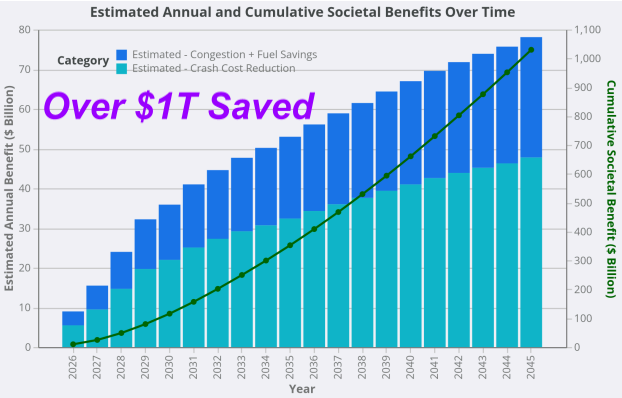 Combining these, our $1.03 trillion total over the projection period (e.g., through 2045) represents massive economic and human value — safer mobility, reduced productivity losses, lower healthcare/tax burdens, and environmental gains from less fuel waste/emissions.